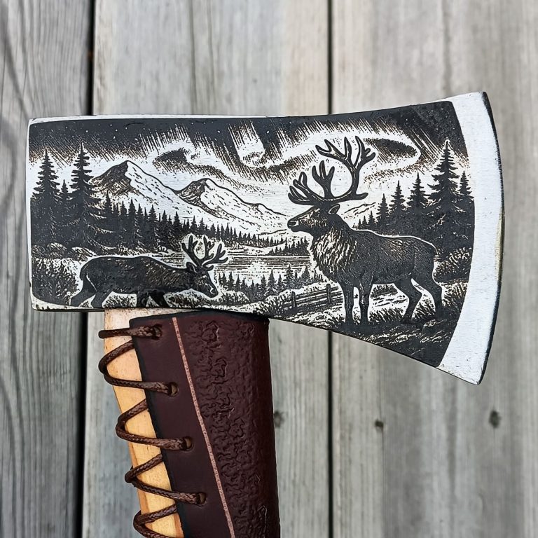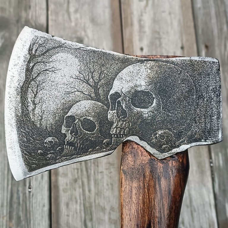 Här hittar du webshop för färdiga produkter och kontaktinformation om du vill beställa en egen yxa med personligt motiv.
